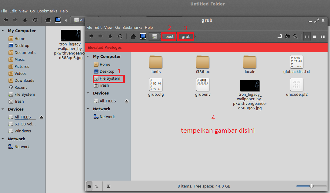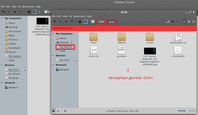 - Setelah itu Salin gambar tersebut dan tempelkan di Folder boot>grub yang ada di Partisi File System