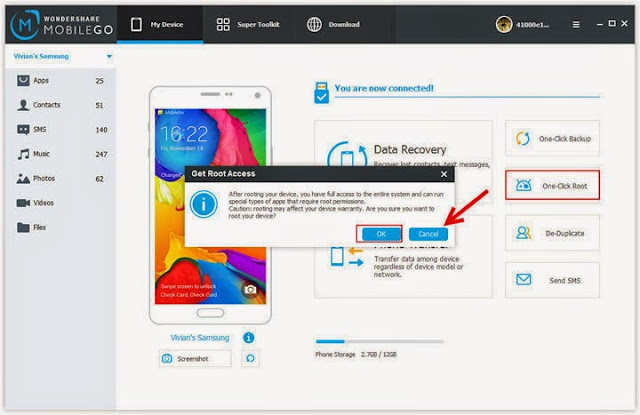 - Setelah Perangkat anda dikenali oleh Aplikasi MobileGo, lalu klik tombol One Click Root. lalu OK