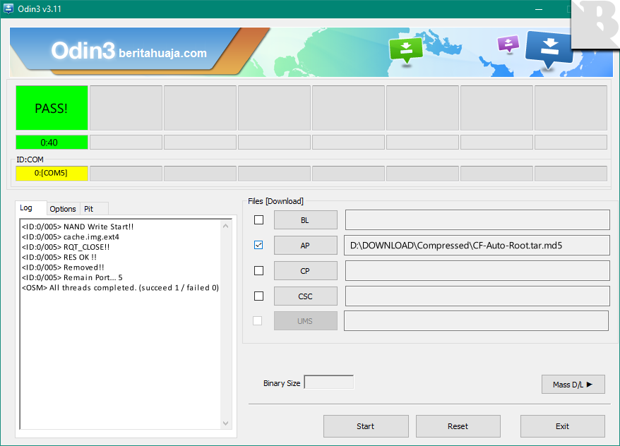 - After that, now click on the Start button in Odin3 application to make the process quick Rooting on your Samsung Galaxy Alpha device using CF-Auto-Root.