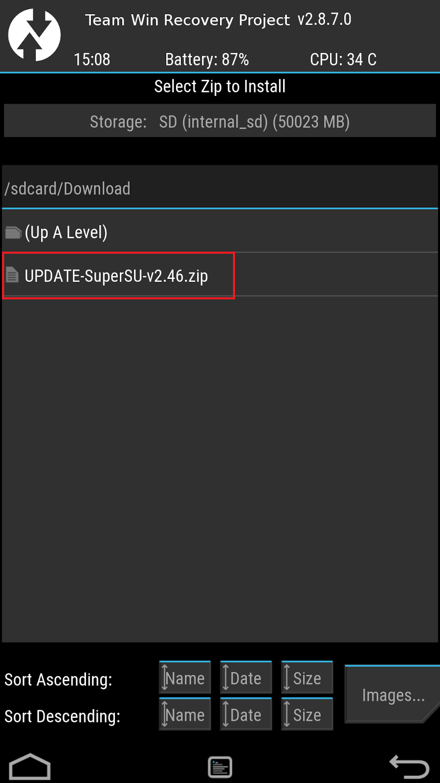 - Once you boot into TWRP recovery mode, Press on Install and select the package SuperSU.zip who have moved to SDCard device Evercoss One X (Android One).