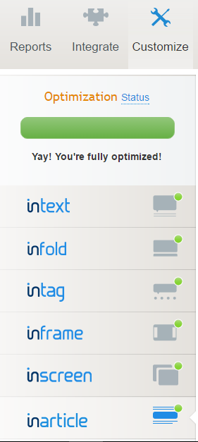 - Sekarang pilih jenis - jenis iklan yang ingin dimunculkan, kemudian klik "Turn on" lalu klik tombol "Save". Pastikan status "Optimization" penuh.