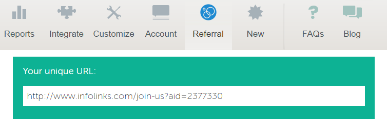 - Pergi ke bagian "Referral" di Dashboard akun infolinks Anda, akan terlihat link Referral yang siap Anda bagikan kepada Blogger lainnya untuk meminta mereka bergabung menjadi Publisher Infolinks melalui link yang di sediakan.