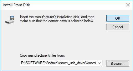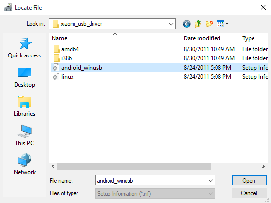 - Click Browse button and navigate to file android_winusb.inf in the folder Xiaomi USB Driver