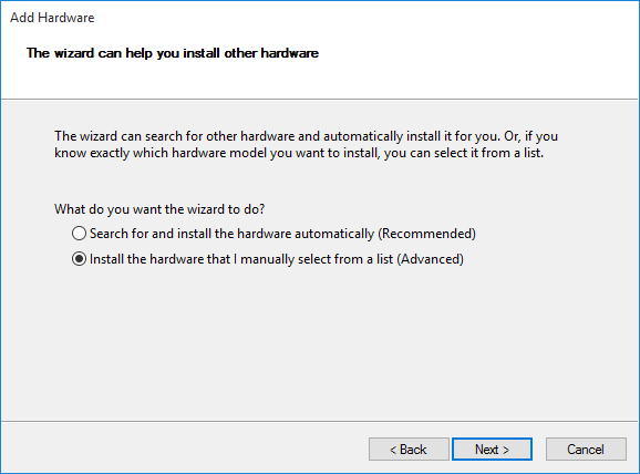 - Then select Install the hardware that I manually select from a list (Advanced), click Next