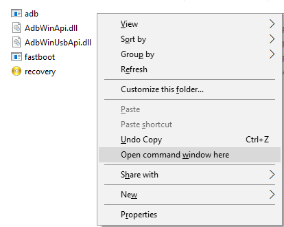 - In the folder (C:/adb), press "Shift + Right Click" and then choose "Open command window here".